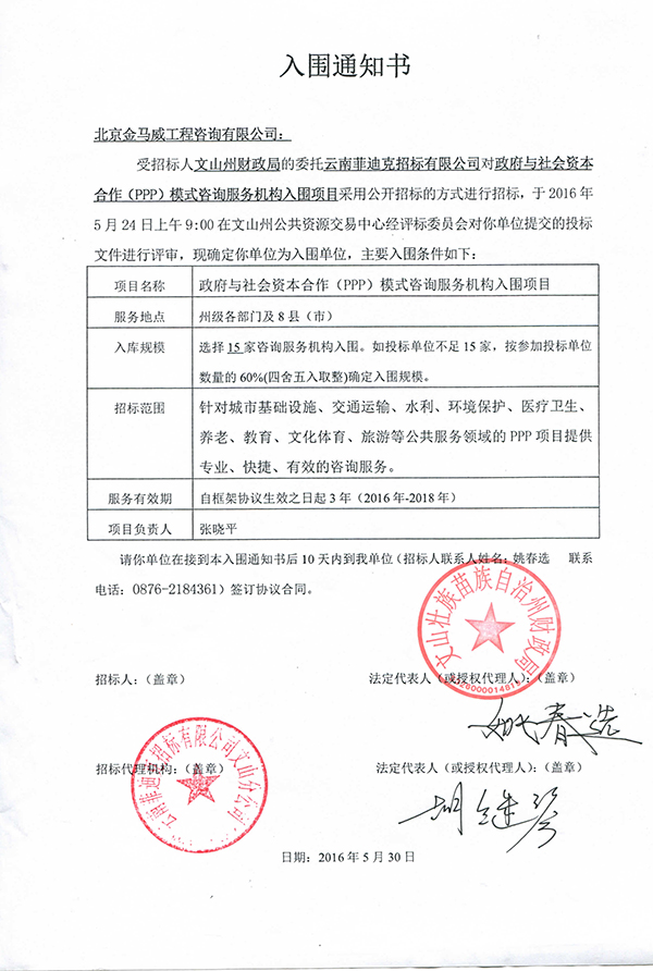 北京金馬威工程咨詢有限公司入圍“文山州財政局政府與社會資本合作(PPP)模式咨詢服務(wù)機構(gòu)入圍項目”